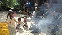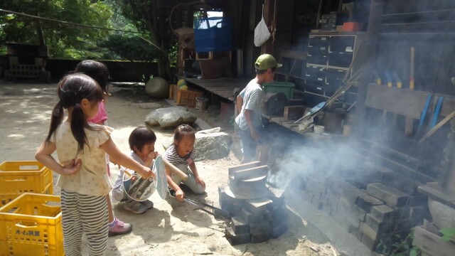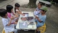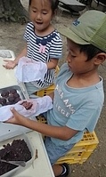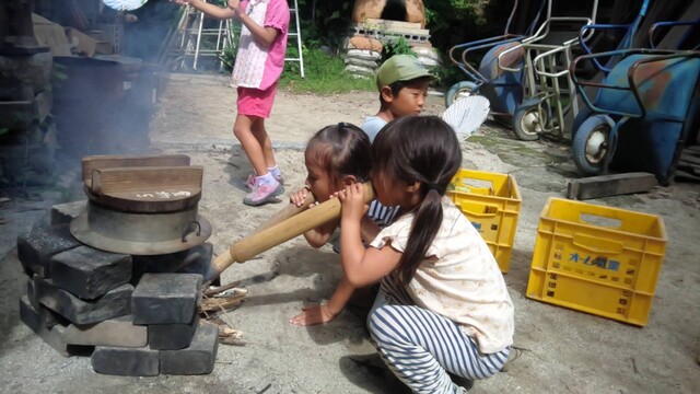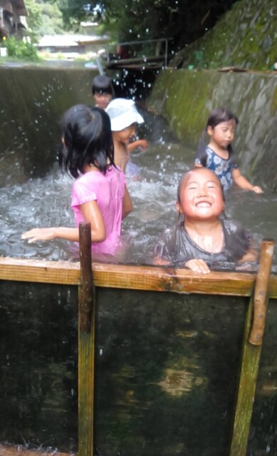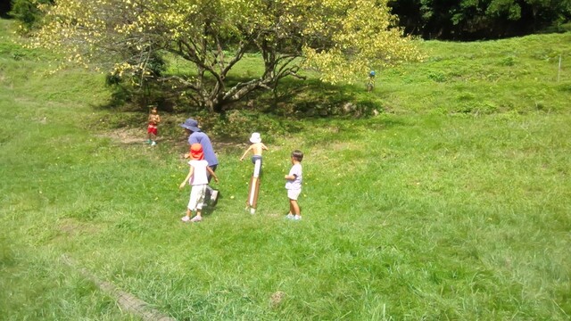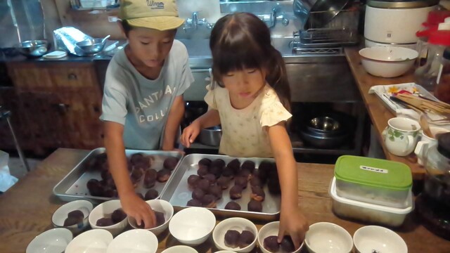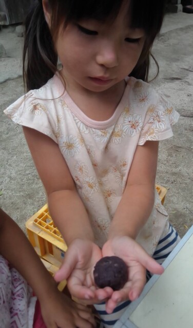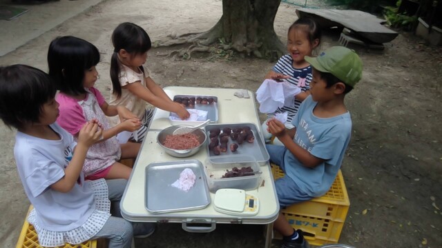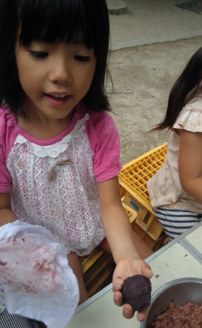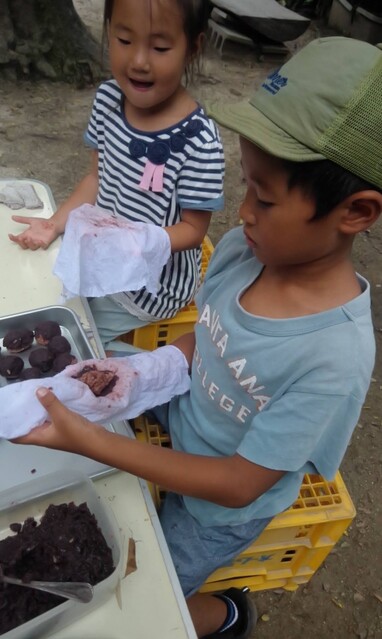 けいどろが、まひろ、みお、あみ、らく、みなと、ゆずき、ちほ、かほ、ももちゃん。 いちか、さゆきは、縄跳びのあと、けいどろに合流。 けいどろ、たくさんだ。 川プールがたまるまでの時間を使って一走りのメンバーもいる。 わたしは、川プール。 りっか、かほ、ちほ、みおと。 りっかも上からジャンプして飛び込むようになった。 ちほ、みおは、犬ごっこをしてる。 今日は、ちほが、みおとあそびたいと言って、みおと遊んでる。 川プールの横では、なりだしたむかごを取って、食べたりしてる。 最後には、けいどろのメンバーも全員川プールにドボン。 けいどろのあとの川プールは、最高に気持ちいいからね〜(^^) 午後は、わたしは、おはぎ作り。 けいご、いちか、さゆき、あみ、かほとお庭でやった。 あんこは、わたしがおうちで炊いてきた。 もち米(赤米)は、焚き火でみんなで炊こう。 煙モクモク。 いい火加減だよ〜。 必死でパタパタしたり、フーフーしたりしてる。 うん、バッチリ炊けた! では、テーブルをセッティングして、並んで座る。 それぞれに濡らしたサラシの布を渡す。 その手にあんこを乗せて伸ばしてもらって、もち米を乗せる。 小さな手だから可愛いサイズのおはぎになる。 上手にあんこでくるんでいる。 ずっと、楽しそうで、わたしも楽しい。 「ほら、見て〜」 自分で作ったおはぎの出来に満足そうな子どもたち。 どんどん作る。 全部で60個くらいできた。 たくさんできたから、てらこやさんにも持っていこう。 トレイに乗せて、子どもたちがまあみんに渡しに行った。 「いっぱいできたから、たべてね。」って。 それから、片付けをして、お皿に盛り付けるのも交代でやっていた。 バッチリでーす(^o^) お昼から、みお、ゆずき、ちほは、よしみさんと山の広場に行っていた。 思ったよりは、蚊が少なかったらしい。 ちほが、今朝、山の広場に行って遊びたいと言った。 ふと、思い出したんだね。 ちほの好きな木の棒で棒を打つ一人野球がしたくなったみたい。 これから、また、山で過ごすことも増えてくるかな。 もう少し蚊がいなくなったら。。。 みおは、よしみさんとごっこ遊びをしながら、 「おかあさん、カブの種まいて大きくなったから取ってくるね」 「ねずみが食べてるのもあったわ」 と言って、スープを作っていたそうだ。 ゆずきは、竹を切って、コップを作ってた。 ももちゃん、らく、みなと、りっかは、セイタカアワダチソウを剣にしてたたかいごっこ。 まひろ、きょひとは、紙飛行機飛ばし。 おはぎ、おいしかった! by よっこ |