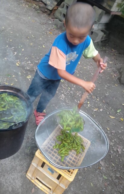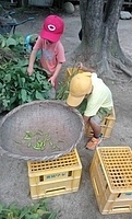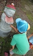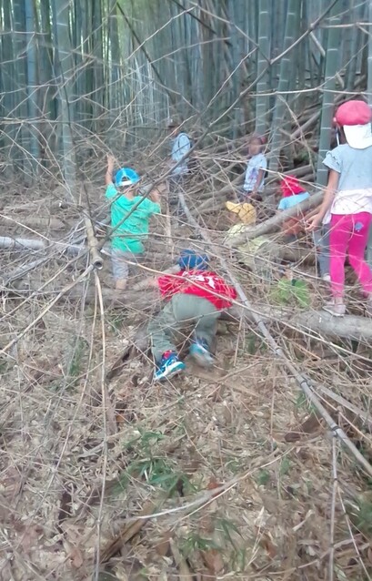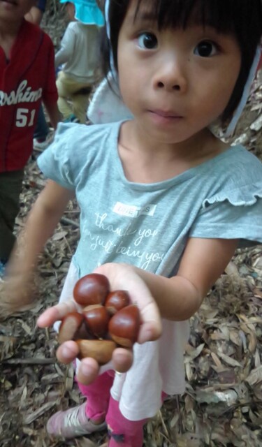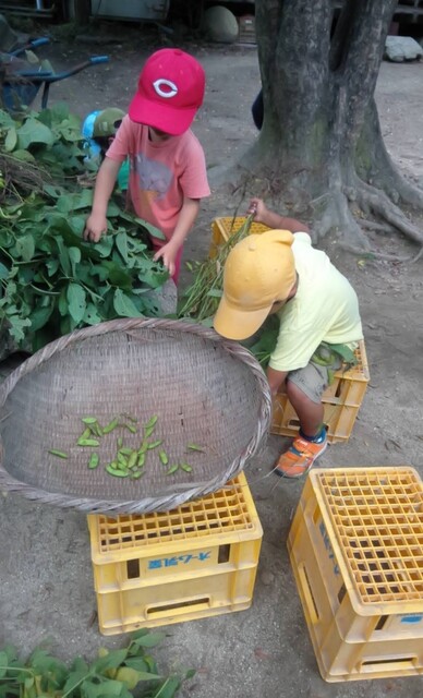 きよひと、けいご、さゆき、きょうが、抜いた枝豆を運ぶのを何往復かしながらお手伝いしてくれた。 収穫した枝豆をもぐのは、きょう、まひろ、ゆずきがやる。 丁寧に取ってくれる。 もいだ枝豆を午後から湯がいておやつで食べようね。 午前中は、全員で般若寺へお散歩した。 今日でおうちえんの保育を終えるあやちゃんが行ってみたいと言ったので、みんなで連れて行ってあげよう。 案内できるかな〜♪ 船の原っぱから旧参道を通っていく。 途中でむかごを見つけて斜面を登って取るいちか。 きょう、あみ、みお、なおとは、ごっこしながら歩いてる。 森の中は竹でガシャガシャだった。 そこをあえてもぐって通っていくきよひと、なおと。 忍者修行だと言って(^^) 楽しんでるなー。 まひろは、竹の皮で飛行機を作ってた。 竹林を抜けると、階段を上がって山門に行く道がある。 そこを通らずに手前から「こっち、行くよ〜。忍者の行く道はこっちだ!」と山の斜面を上がっていくけいご。 あとにきょう、きよひと、あみがついていく。 あみ! あみがそこにいるのがびっくり。 いいな〜、心が動いたんやな〜。 その感じが気持ちよかった。 山門に着いて、仁王様のマネして、閻魔様のところに行って、上のお堂に行って、龍の池に行って。。。と、いつもとおんなじように進み、ボスちゃん(犬)にも会いに行こう。と行ってみる。 いつもだったら、子どもたちの声がしたら、出てくるボスちゃんが来ないから、奥の犬小屋の方まで行ってみたけど、いなかった。残念。。。 そして、山の中を通って帰ることに。 わたしは、りっか、みなと、まひろと先に出発した。 般若姫の伝説みたいなのを他の子達は、読んでもらっていたから、ゆっくりめの3人とスタートしておいたほうがいいなと思って。 ところがどっこい、この3人が、めちゃくちゃ走って坂を登っていくもんだから、びっくり! あとからのメンバーが追いつくことなく山の入口まで来ちゃった。 そして、後ろからみんなが走ってきた。 森の入口は覚えていた。 蚊とかがいないといいなあ。。。と思ってたけど、よかった、ぜんぜんいない。 快適な竹林の中を、竹落葉のふかふかを踏みながら、超ハイスピードでおりていった。 わたしは、最後のなおと、みなと、まひろ、りっかとおりていったけど、このメンバーも遅いわけではなかった。 みんなが早すぎ〜!! 鉄塔のところで草の上で転がって遊んでたようだ。 そして、さらにおうちえんの方へ進んだところで、みんなが止まっていた。 斜面にもたくさん子どもたちがおりている。 山栗がたくさん落ちていて、拾いまくっていた! こりゃやめられんわね。 もっともっとゆっくり取りたそう。だって、まだまだある。 だけど、お昼過ぎたし帰ろうか、また来たいなら、昼からでも、明日でも来られるよって言って、またあるき出した。 お昼からは、わたしとゆずきは、枝豆を湯がく。 手際のよいゆずき。 火加減ばっちし、塩加減もばっちしで、うれしいわたしたち。 たくさんあるから、てらこやさんにもおすそわけ。 みんなで分けたら少しだとおもうけど、どうぞ! おうちえんの枝豆はむちゃうまなのだ! あやちゃん、一ヶ月半ありがとう! by よっこ |