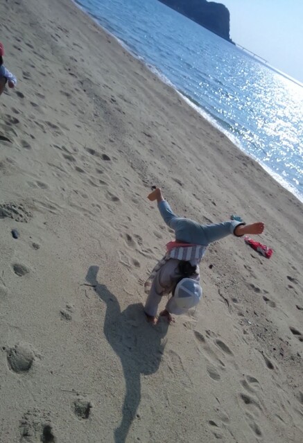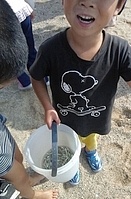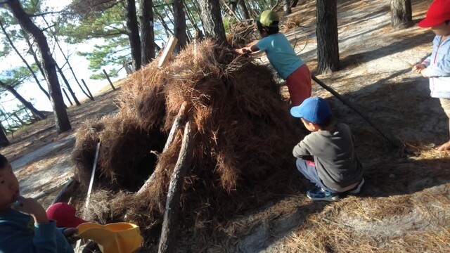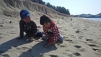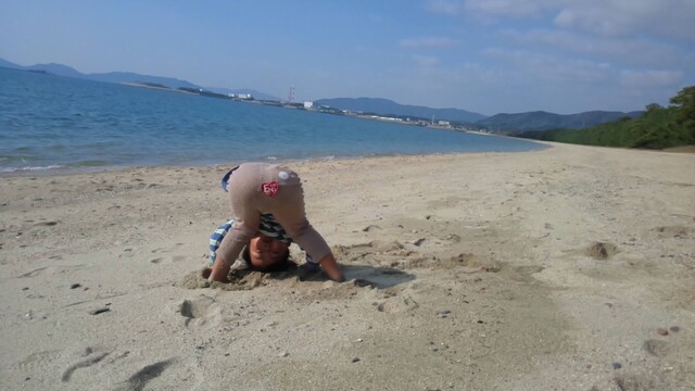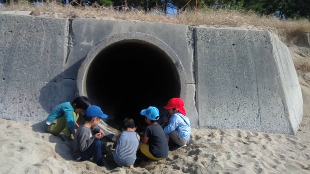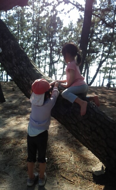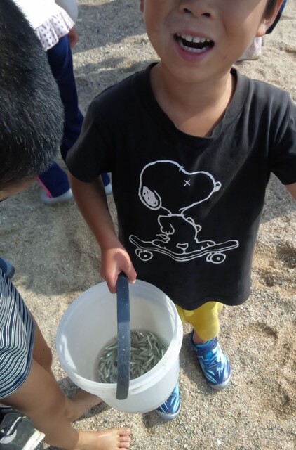 イワシ!!久しぶりだなあー。 でっかい魚に追われて浜に打ち上げられたイワシの稚魚を拾ったり、がんぜきでかき集めたりした思い出。 それに出会えるかもしれない。 っていうことで、今日のお出かけ先は室積海水浴場の浜へ。 小春日和とはこのこと。あったかくて、まったり。 浜についたら、まずは、みんないつも泳ぐ方角を目指して歩き始めた。 全然立ち止まらずにどんどん進んでいってる。端っこまで行くんかな。 今のところ、イワシはあがっていない。 あつおさんは、鳥の動きを気にしながら居る。 途中からは引き返して、みなと、らくとのんびりしてたよう。 他のメンバーは、随分歩いた先でなんとなくとどまって、おうちごっこしたり、砂にお絵かきしたり、土管の中から水が出てくるところに拾った筒をつなげて水道を作ったり、海に入ったり!!してる。 ちほは、水切りの練習をずっとしてた。めちゃ、ストイックに繰り返している。 そして、上手に出来るようになった。 いろんな石を取ってきては、投げてためしてる。 海に入るりっか。 ももちゃんの手を引いて、「いっしょにすわろう」って。 ももちゃん!!いくの!? ももちゃんは、りっかの横に座った。 そして海に入る子が増えて、ゆずき、ちほ、まひろ、かほも入ってた。 さあ、お昼。 また、元の場所に戻らんとね!走って帰る。 長い長い砂浜を。 気持ちいい〜。 そして、戻ったところに!!イワシが来てる!! たくさんじゃないけど、来てる!! それを拾って歩く。あ〜、楽しい〜。 いわし、来た〜!!よかった〜!! バケツに入れる。 おむすび食べる途中も、鳥がたくさん見えたら、あつおさんたちが走っていって取ってた。 ももちゃん、みつき、ゆずきは、食後に遠くまで行ってイワシを拾ってた。 わたしは、きよひとと一緒に拾いながら浜を歩いた。 かほ、みなと、さゆき、いちか、みお、あみたちは、おうちごっこ。 あつおさんと男の子たちは、松ぼっくり投げ。 それから、松林でおうち作りが始まった。 わたし、かほ、みおは、ユニコーンごっこをしていて、松の木をユニコーンに見立てて遊んだ。 出来たお家に入ってるけいご、きょう。 素敵なのが出来ていた。 ゆずきも自分のお家を作ってた。 お家は、撤収して帰った。 イワシが上がってきたのは、すごく楽しくておもしろかった。 イワシが上がってない時間に思ってたのは、まったり、ゆっくり、何もしなくてもいいなあ。何もしなくても実は、なんかしてるんだなあ。そんなこと。 今日の浜での時間は、ただそこにいるだけでもここちよかった。 いわしは、みんなで少しづつ分けた。帰っておうちで唐揚げにしてもらったみたい。 きっと、おいしかったよね! (わたしは、浜で、生のまんまを味見した。) by よっこ |
