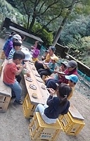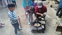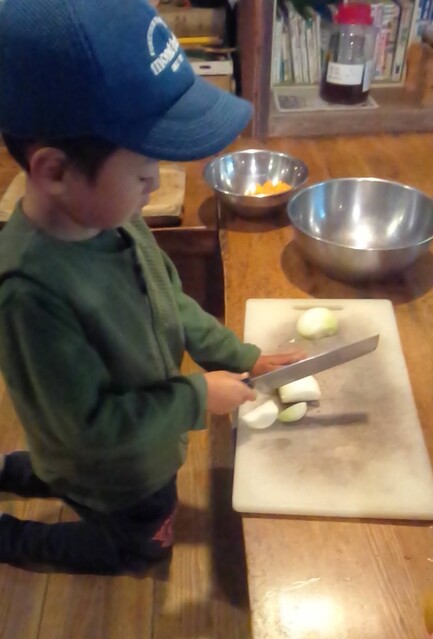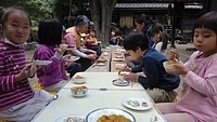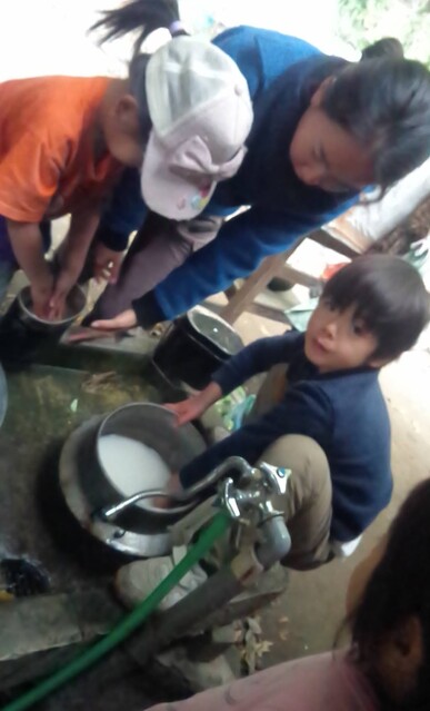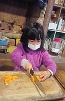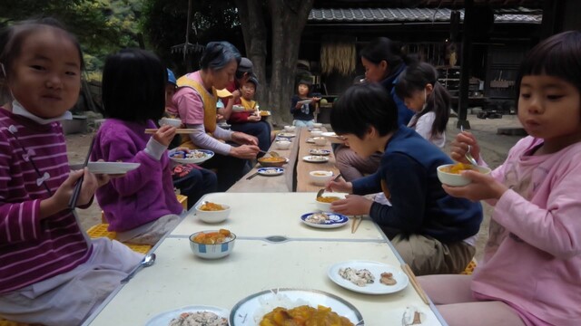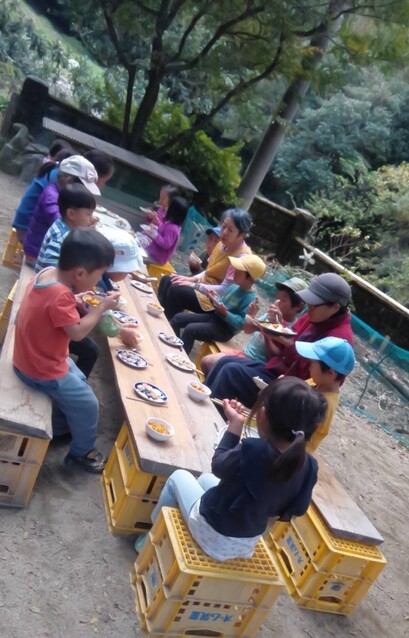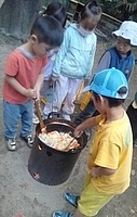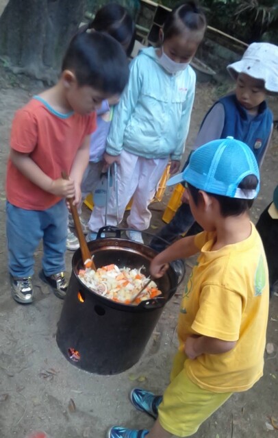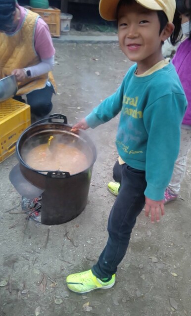「カレーを作りたい。」とりっかからのリクエスト。 やりたい。を届けてくれることが、うれしい。 カレー班。。。きよひと、きょう、なおと、かほ、さゆき、あみ、ゆずき、いちか、まひろ ごはん班。。。ちほ、けいご、りっか おかず班。。。みお、みなと 自分で選んで分かれた。 おや?りっかは、カレー班じゃないんだ(^^) ご飯炊くのを選んだ。いろいろやってみるのいいね! (あとから聞いたら、りっかは、今、おうちでもお米を洗ってご飯を炊くのを楽しんでるみたい。) さあ、はじめよう! カレー班は、たくさんいるから、お野菜切りや皮むきもどんどん進んでる。 みんな、上手に包丁も使ってる。 いつみても、その危なげのなさには、感心する。 みんなが避けたい玉ねぎ切りは、なおと、かほが、「やる!」 終われば、「まきをあつめにいってくる。」と、今度は、火を付ける準備へと動き出す子どもたち。 頼もしい限り。 わたしが、カレーにこないだみんなで掘ったさつまいも入れるのどうかね?って、かほに聞いたら、「入れよう入れよう」 「かほちゃんが切るね。」と言って、張り切る。 お隣では、おかず班のみお、みなとが、あっきーと白和えを作ってる。 あっきーは、人参の皮をちょうだいって言ってそれも使ってた。 すり鉢でごろごろすったり、お豆腐の水切りしたのを手で混ぜ混ぜして2人が楽しんでる。 お外に行ってみたら、カレー班は、お鍋に具を入れて炒めてた。 火の調子もバッチリ。 交代しながら混ぜたりしてた。 ごはんたきの3人は、ちほ、けいごは、それぞれ自分の飯盒を担当。 りっかは、羽釜でみなぎと炊いた。 けいごは、自分で炊くことに今はもう自信持ってやってる感じ。 ちほもたくさんやってきてるけど、今日は、ひとりでやるのは初めてでちょっと不安もあったみたい。 なかなか火を保つのがうまく行かなくて苦労した。 最終的には、ちゃんとたけていたのだけど、「泣きたいし、悔しい感じ」と言ってたようだ。 その経験も大事だね。 さて、おかず班のみお、みなとは、もう一品のれんこんソテーをやってる。 お鍋は、たくさん見てるから、今のうちにテーブルのセッティングしようと声をかけたら、さゆき、あみ、いちか、かほが、集まった。 おお!今日は、女の子たちだ。 長い重い板をかかえて運ぶ。 椅子を並べる。 OK(^o^)v みんなでキッチン。みんな、よく動き、作るのを楽しんでた。 どれもこれもおいしかった〜。 お昼からは、けいどろをたくさんの子(てらこやの子も)でやってた。 わたしは、大縄をいちか、あみ、りっか、かほ、ちほ、さゆきとやった。 ひよこになってて、「ピヨピヨピヨ〜」って言いながら、とんでた。 みなと、ゆずきは、紙飛行機を作って飛ばしてた。 終わると、2人で川に降りてカニを探してた。 さゆきは、鉄棒で逆上がりができるようになった。 by よっこ |