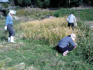 近郊の町、下松から来たHさん、「どうしても稲刈りをマスターしときたいから、残しておいてほしい」と電話があったのは、つい先週のこと。 火曜定休の料理店を経営されてるため、火曜しか稲刈りできないため、という。 夏、誰かの紹介で訪ねてこられて以来、実に熱心な方だった。 耕さない田の稲の実際にびっくりされ、来年から地元へ帰っての半農暮らしを決心された。 何度も足を運ばれ、しょっちゅう質問の電話があった。 そういう経緯があったため、あえて日曜のみんなでの稲刈り、稲を刈りきらずに残しておいた。 そして今日、稲の刈り方、結わえ方、はぜの作り方、掛け方、一連の作業をこなし、 マスターされた、と思う、たぶん・・・。 聞けば、もう11月で店を閉め、準備を始めるとか。 行動が早い。(年配の人なのに、、、、感心) 10年目の自然農の田の上で4人、秋の風が妙に心地よい日だった。 土曜は、山口市から車で2時間かけて、青年が来た。 今は仕事のかたわら、かやぶきの古民家を再生している。 来年、家が完成したら、アフリカへ1年間ボランティアに出るんだという。 そして帰ってきたら、田んぼを始める、と目を輝かせる。 彼が手伝ってくれたのは、自然農1年目の6畝の田んぼ。 そこはまた、いい出来だった。 1年の管理を手伝ってくれたNくんにも、感謝。 先週もどこかの稲刈りに参加してたらしいが、つかんだ感じがぜんぜん違うと、株の太さにびっくりしていた。 もう二人手伝ってくれていた老夫婦も、耕さずにこれだけできるのか、と口をあけていた。 山口の青年は、「来てよかったです。」と確実な手ごたえをつかんで帰っていったようだった。 いずれも、日曜のみんなでの稲刈りに参加できないから、と日をずらしての稲刈り講義。 「忙しいのにすみません」と、みんな云われるが、とんでもない。 僕はうれしいのです。 だってそれだけ本気だってことだし。 農のある暮らしをする人が増えるのに、僕がやってきたことが何らかの役に立つのなら、これほどうれしいことはない。 店休んででも、教えるよ、ほんと。 今年は他にも、田んぼを始めた一年生が2組。 1組は年金暮らしの夫婦。 1組は、農的暮らしをめざすすてきな養鶏やさん夫婦。 今までうちの田を体験、観察に来られてた人たちだ。 どちらも今年は耕した普通の田んぼだが、なにしろ米作りを実際に始めたのだ。 そしてどちらもとってもよくできていた。 1年目の収穫の手ごたえ、うれしいだろうなあ。 こちらもうれしくなる。 どの人も、実際に動き始める人たちだ。 まず動く、やってみる。 うまくいっても、いかなくても、続ける。 工夫する。 そんな人たちは、かならず自分なりのスタイルを確立する。 今年は見学者、質問の電話、メール、特に多い年だった。 俺、何屋だったかな? 最近自分でもわからなくなる。 ここんとこ、半農の暮らし方を目指す人がとっても増えた気がする。 着々と、世界の色は変わりつつあるのを実感する。 うれしい日々です。 |