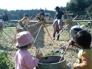 今年初めて参加した方も何組か。 大人10数名と子ども10数名。 子どもたちは例年のごとく、迷路つくりに夢中。 まあ最初は迷路を作るとか言ってたが、なかなか迷路にならない。 結局「道つくりだ」と言い直してた。 稲刈り何年目かの子たちは、慣れた手つきで稲を刈っていた。 そりゃそうだ、うちの光なんか、幼稚園の時からやってるから、そこらの大人より上手になってる。 幼稚園児は、1株じゃなくて、一本一本一生懸命刈っている。 遊びに夢中で、大人たちが刈っておいてある稲藁を踏みまくる子たち。 あぜに据えた釜戸で、黒豆を湯がく。 大量の枝豆をほおばる。 今が旬の味。 稲を干すハゼを利用した特製ジャングルジム。 大きいのは小学生用。 小さいのは幼児用。 2歳の真も上ろうとしてたが、あきらめて、黒豆を湯がいたあとの釜戸でのままごとごっごに参加してた。 竹の上でミカンをほおばる子ザル数匹。 毎年恒例、秋のとある日曜日の光景。 いい風が吹き抜けてたよ。 |