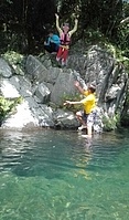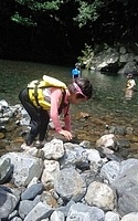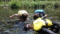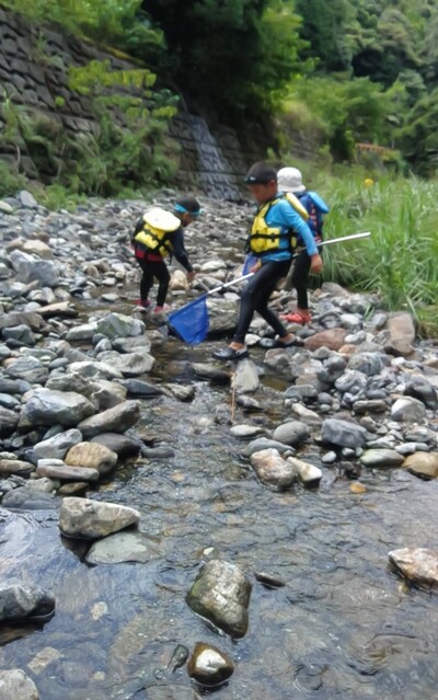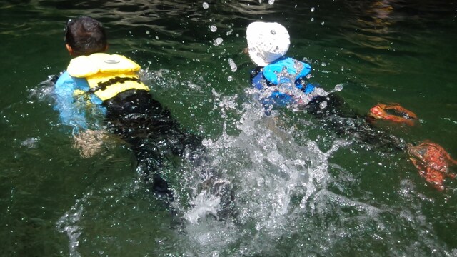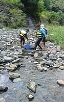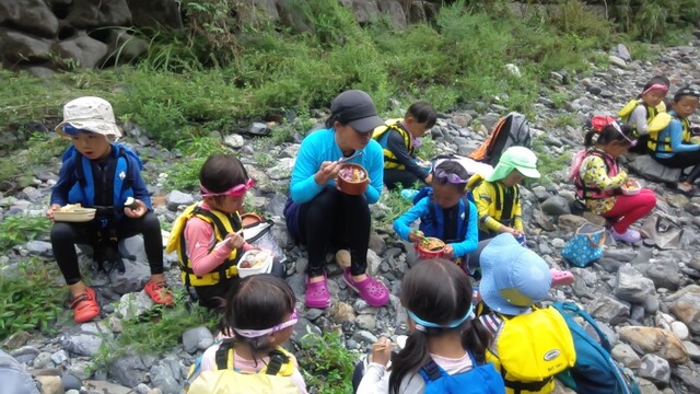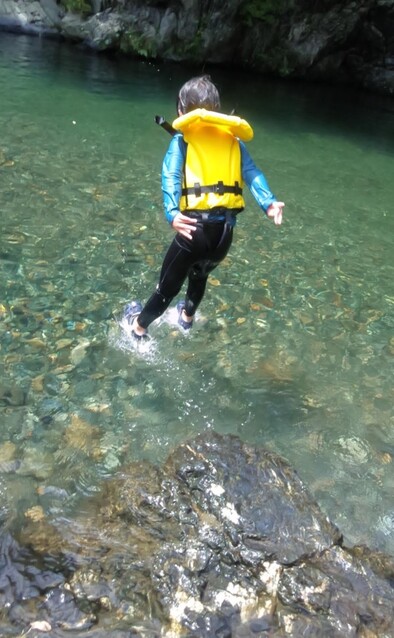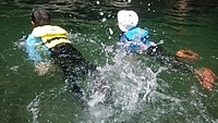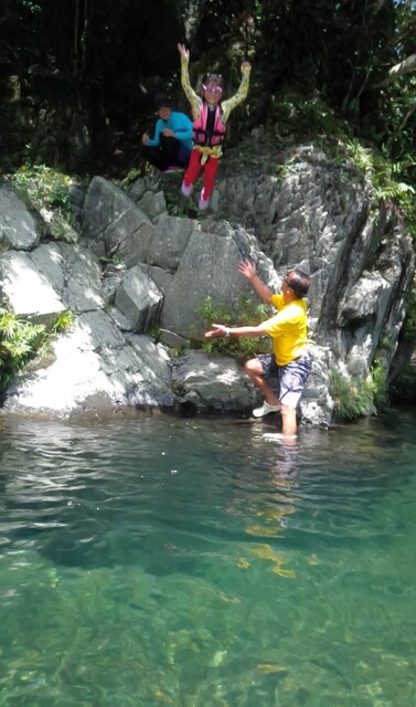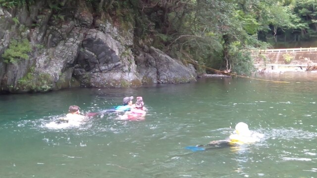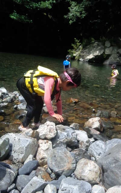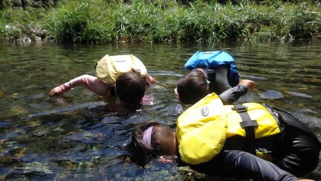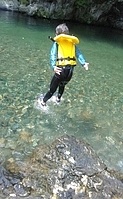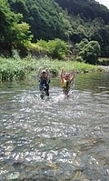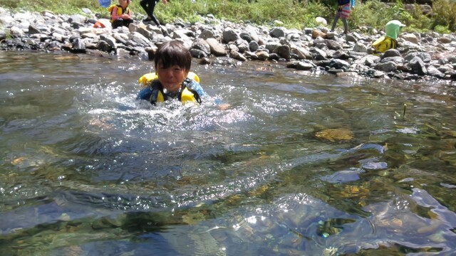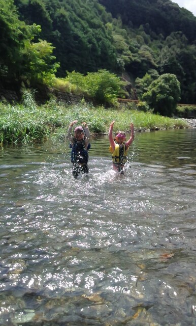 一緒に行ったかほ、さゆき、まひろで取った。 かほ、わたしは、帽子に実をいくつか取って入れて持って下りる。 そして、「いらっしゃいませ〜、とれたてのブルーベリーはいかがですか〜」と、ブルーベリーやさんになって、お庭にいるメンバーやスタッフ、送りに来てたおかあさんたちにくばった。 今日は、岩国の根笠川へお出かけ。 透明度が高くてきれいだった。そして、穏やかな流れだった。 泳ぎ、魚を見て楽しむ。 わたしは、きよひと、みなとと深い方へ行って魚を探した。 岸辺では、石を割ったり、石投げをしたり。 石でうさぎちゃんとか作ってる子もいた。 魚取り、カニ取りも。 カニがちょうど産卵の時期だった。 お母さんのおなかから赤ちゃんがはみ出してる。そんなのが何匹もいた。 お母さん、逃してあげよう。がんばってね。 さゆき、ちほは、とにかく飛び込みがしたくてしょうがない。 あっきーと飛び込み岩に登っていく。 そして、下で待ってるあつおさんが、この辺に飛んで!という方向へ思い切り飛ぶ。 爽快。 けいご、きょう、ゆずきも飛びに行った。 さゆき、ちほは、何回もやってた。 わたしも飛んだ。ドボン! 川でみお、いちか、みなとが、ゴーグルを付けて、顔をつけてる。 顔だけをつけてる様が面白い。 「魚、見えた!」 その後、みお、いちかは、川の中でごっこ遊びをしていた。 ちほ、かほ、さゆき、まひろは、石をたくさん積んで温泉とか池とかを作り、「入っていいよ〜。」 うん、気持ちいいです(^^) それから、少し歩きながら魚取りをまひろ、みなととした。 石を割って粉を作って、メイクやさんをしてた子 もいた。私もメイクしてもらった。 お昼ごはんのあと、上流から流れながらここまで戻ってくるコースに、けいご、かほ、ちほ、ゆずき、きよひと、なおと、さゆきがあつおさん、あっきーと行った。 残ったみお、いちか、みなとが、あみを持って小さな小さな魚を取ってる。 さっと動かしたら、それぞれの網に入ってる。 よかったね〜。 まひろ、りっかは、程よい高さの岩から飛び込みをしてる。 楽しくて何回も何回も飛んでる。 この間行った黒岩峡では、りっか、まひろは、川の流れが怖くて、あんまり遊べてなかったから、そんな姿が見られてよかった! ここで過ごすうちに川で遊ぶことが徐々に体に馴染んできてそうなっていった。 今日の川のコンディションがおうちえんの子にはちょうどよかったな。 行く時々で川の表情は違ってる。 上流から流れる組が泳いでくるのが見える。 おかえり〜! 川遊び日和で満喫した。 今シーズン、もう一回、来たいな。 今度は、わたしも上流から流れながら、川の魚をいっぱい見たいな。 by よっこ |