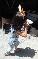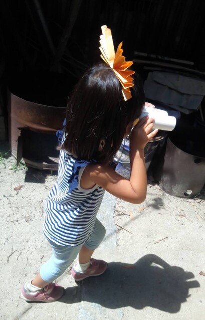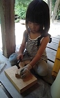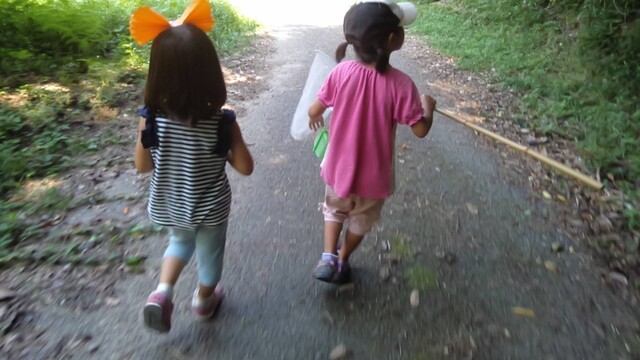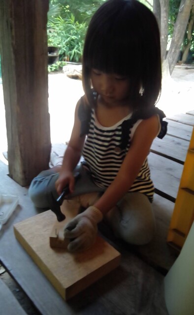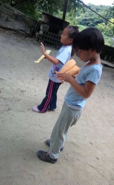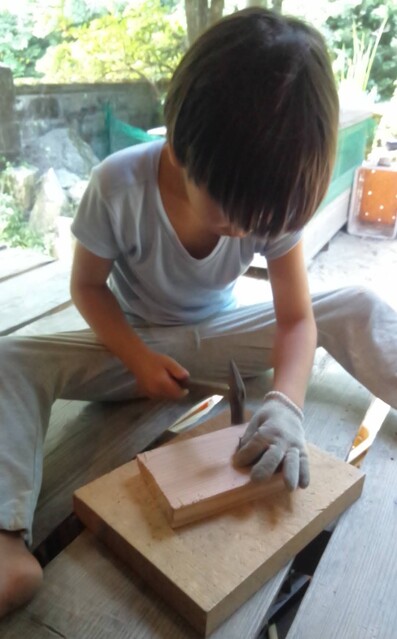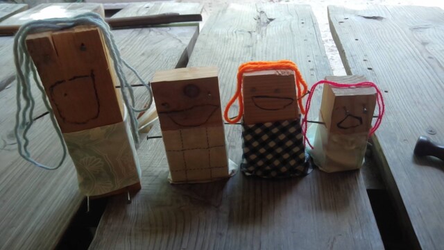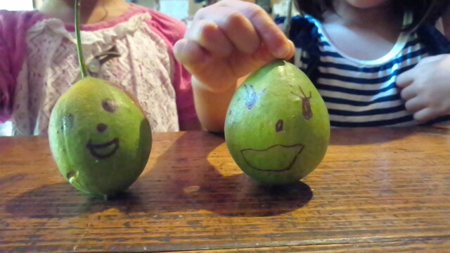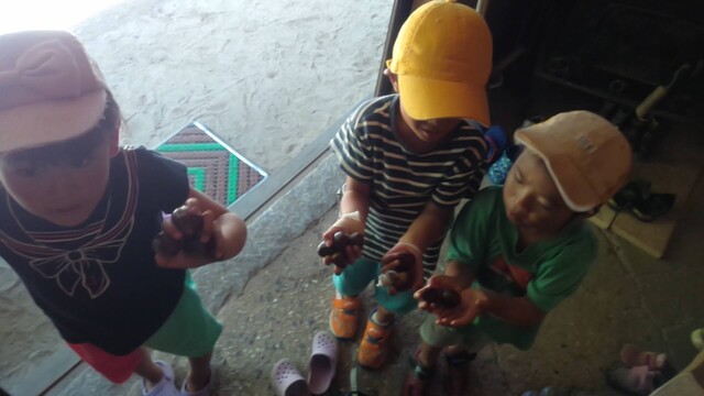 朝、あっきーが、もう、栗落ちてるんじゃない?って、子どもたちと見に行った。 おうちえんの栗は、早生で8月の終わりから生る。 あったよ〜。 取ってきて、見せてくれた。 少し前から角材に釘の手足を付けたお人形(かわいこちゃん)作りが流行りだして、今日もみおが、作ってる。 みおは、毛糸の髪の毛を付けて、布で服も着せた。 もう一個、もう一個と楽しそうに作って、自分の家族4人を並べてる。 素敵ね。 りっかもそばでトントンして作品作ってる。 お部屋では、あみ、みなと、いちか、さゆき、かほが、折り紙、工作、お絵描き。 あみの作るものが、だんだん立体的になってきた。 みなとが、絵を描くのは、あんまりなかった。 今日は、人の絵をたくさん描いてる。 初めて見た。 「かわいこちゃんよ」とってもかわいい。 丸から足が出てる頭足人。 教えられてない健やかな絵だ。 わたしに2枚くれた。 いちか、さゆきが、紙飛行機を作って飛ばしてる。 結構飛ぶね! 2人とも上手に飛ばす。 この紙で作るとよく飛ぶんだね!発見。 りっかも飛ばしたくなり、私と作って、それを持って、3人は、お庭に出た。 かほは、折り紙や工作で作ったものを売るお店屋さんがしたい。と、作品を作ってた。 お昼ごはんのあと、お店を広げてた。 かほのおみせで、買ったリボンを付けたみお。 手には、買った望遠鏡を持ってる。 その格好のまんま、あみ、わたしと虫とり散歩に行った。 望遠鏡を覗きながら歩く姿が面白かった。 あみ、みおは、「かぼちゃん」と呼んでる実を取ってきて、「これにも顔描いたら可愛いんじゃない?」って言って、かぼちゃん人形にしてた。 by よっこ |