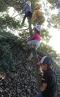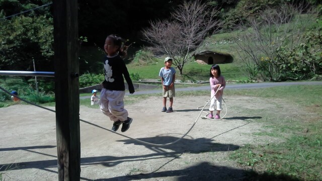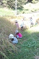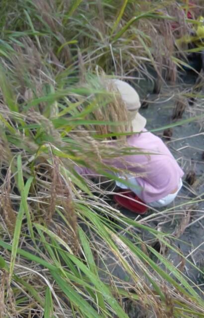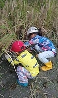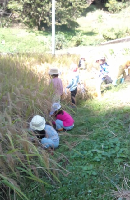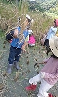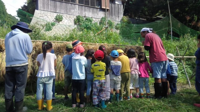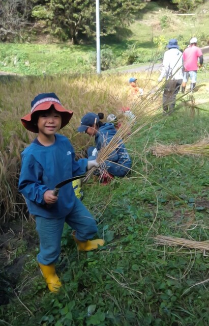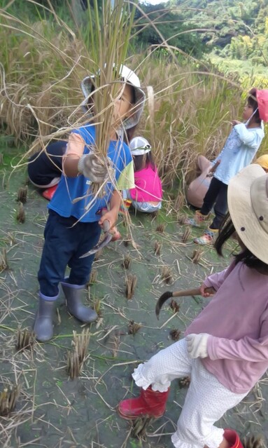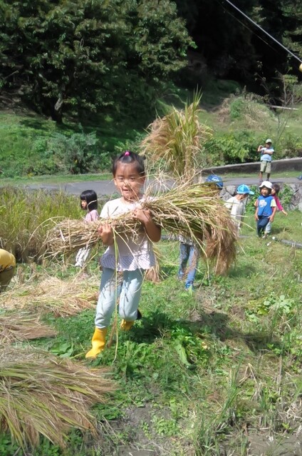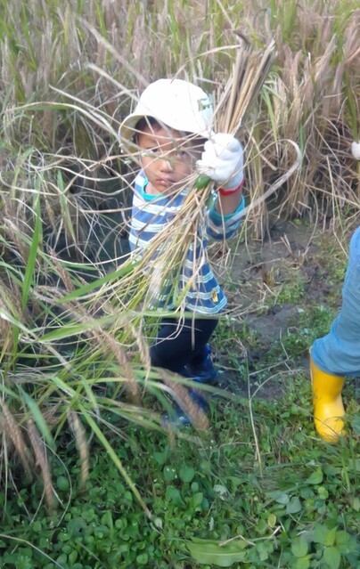 今日は、みんながお待ちかねの稲刈り。 特には、年中のメンバーが楽しみにしていた。 年長のメンバーには、10月のはじめに黒米の稲刈りを手伝ってもらった。 なので、なおのこと、やりたかったあみ、きよひと、なおとは、出番を待っていた。 今日の稲刈りは、赤米。 田んぼの周りを囲む緑米は、まだ刈るには早い品種なので、残す。 なので、黒米が終わってる分、刈る範囲は狭い。 年少さんどうかな〜。 あつおさんの説明を聞いて、いざ稲刈りの開始。 丁寧に刈ること、怪我をしないようにやること。 始まってみたら、みんながやる気なのが、ビンビンに伝わってきた。 わたしは、りっかとみなとについていたけど、危なげなくやっていたし、となりのみなぎがみていたらく、まひろもしっかりやっていた。 小さい子は、何回かやったらいつもなら飽きてやめているけど、らく、みなと、まひろは、ずっとやりたいと言って刈り続けていた。 小さい子たちを見ていたから、他のメンバーの様子は正直こまかくは見えてなかった。 あとから聞いたら、あみ、みお、なおと、きよひと、いちかの年中組が、丁寧に上手に自立してやっていたようだ。 年長のメンバーは、任せて安心の堂々たるもんだった。 少ないかと思ってたけど、結構な量刈ることができた。 くくる作業をきよひと母Hちゃん、わたし、てらこやのしょうまの3人でやる間、みんなには、一回遊んできてもらう。 そして、くくり終わったら、また、集合してもらって、今度は、稲架掛け。 束ねた稲を運ぶ。 全部がかけ終わった。 そして、「今年も美味しいお米をありがとう。」って手を合わせ実りに感謝した。 今年もいい時間を持ててうれしい。 自分たちで種を撒いて、苗を植えて、その育ちを日々、間近に見ながら過ごし、そして、収穫する。 自分たちの手でそれをして、あとはおてんとさまにおまかせする。 無事に稲を刈ることができることがほんとにありがたい。 そこに子どもたちの姿があることが嬉しい。 しかも、稲刈り、楽しい!楽しい!と言っている(*^^*) 子どもたちにとって、仕事も遊びの一つだ。 そして、仕事のおもしろさも体得する。 他の活動は、 午前中は、おおなわ、けいどろ、おうちごっこ。 午後は、しいの木までお散歩、栗拾い(昨日の場所に!)。 by よっこ |