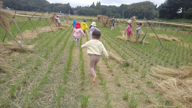 朝のお天気が微妙で、いつ、雨が降り出すか。。。という感じ。 迷った。う〜ん。 でも、行ってみよう!行って難しかったら帰ってこよう。 到着すると、子どもたちは、自分たちで動き出して、散り散りになって、わらを運び始めた。 そして、お家を作ったり、なるに鉄棒のようにぶら下がって遊んだり、おうちごっこしたりして、楽しそうに遊ぶ。 ワラを山ほど運んで、それだけでも楽しい。 工夫しながらお家にしていくのは、面白いね。 そして、よくこの年令の子たちが形にできるのねと、、すごいなあと感心する。 小さい子たちは、大きい子のを見て学ぶ。 わらの中に入って、寝転がってたりして、気持ちよさそう。 子どもたちだけでどんどん遊んでて、大人の手がいる感じじゃない。 入ってほしい感じでもない。 こどものせかい。 少し離れて大人もそれぞれやりたいことを見つける。 なるの一本橋渡りや鉄棒は危なくないように見ておく必要があるからそばにいるけど。 なるの一本橋、さゆき、あみ、けいごがバランス取りながら、あるく。 りっか、みなとも登って上に座るのを気に入ってる。 かほは、わらをひたすら長く長く並べていく。長い廊下みたいに。 そこを、なおと、きよひとが這っている。 みなと、いちか、あみは、どろんこでドーナツやおにぎり、クッキーを作る。 わたしは、毎度のことだけど、なるの一本橋を歩くのと逆上がりは絶対したい。 なるの上に立つ。 あっきーが「背筋伸ばしてー!」「まっすぐ、前見てー」って言う。 そうなのだ。そうして、歩くのが、めちゃくちゃ気持ちいい。 バランス取りながら進むのが楽しい。 だから、子どもたちにも勧めたくなる。 うん、今年もおもしろかった〜。 逆上がりも必死でやる。 あれ、今年は、足が上がらない。。。年々いろいろ衰えを感じる。 結構、時間かかった〜。できた! でも、何十回に1回くらいの確率でしかできなくなってる。 ふ〜。満足した。 走りたくなったから、誘ったら、いちか、みお、みなと、ゆずき、なおと、まひろ、きょうが一緒に走った。 裸足で走って、足の裏が痛いなあと思ったら、結構ザクッと切れていた。 はは、本気すぎる。 それから、わらでみつあみにして縄を作った。 おうち作りにも役に立つかな。って。 そしたら、さゆきも作ってた。 お昼ごはんは、りかさんに届けてもらうようにお願いしていた。 今日は、ちょっと冷えるからとあったかいシチューを届けてくれた。 それが、すごくうれしかった。 とくに、らくは、寒くて泣いてたもんな。 みんな、あったまってた。 昼から、土俵を作ったら、なおとやきょう、きよひとが参戦。 そのうち、熱く(暑く)なって、きょう、なおとは、上半身裸になってた! なおとが今日は、めちゃめちゃのってる感じ! 何回も相撲取ってた。 それから、土俵のはしにわらを重ねて高くし始めた。 こんどは、走ってそれを飛び越える遊びが始まった。 なんか、自然発生的に遊びが変化していくのも楽しい。 あみ、けいご、ちほが加わった。 飛ぶ、飛ぶ! ゆずきが、家ができたよと知らせに来た。 狭い入り口だけど、中は、広いみたい。 こわさないようにあっきーが、入ってみていた。 まひろは、いっぱいわらを重ねてぴょんぴょんしたり、鉄棒が気に入ってる。 みなとは、一本橋の上を歩くのをみなぎに手を繋いでもらって歩く。 あっきーは、お店屋さんを作っていた。ほうきも作ってた。 ほうきを作ってた子が何人かいたな。 ちょっと、パラパラする時間があったけど、行ってすごくよかった! そして、まだまだ、遊び足りない感じ。 続きがしたい感じ。 もっと、遊びたい感じ(*^^*) また、明日も来ようね! by よっこ |