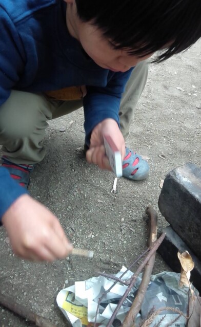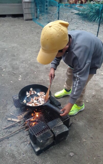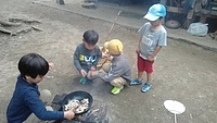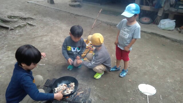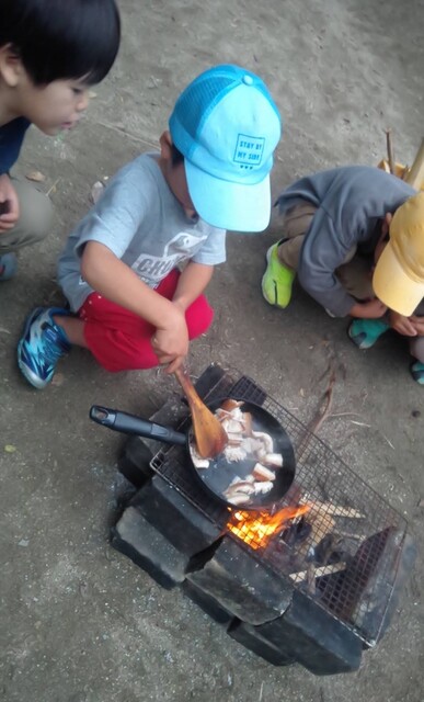 その半分を今日はお料理。 きよひと、きょう、りっか、みなととやる。 お昼ごはんにつけてもらおう♪ 切るのは、きよひとが担当。 準備ができたら、お外で焚き火。 りっかやみなとがマッチを擦って点火。 そして、しいたけを交代しながら炒めた。 味は、2種類。バター醤油と塩すだち。 どうかな〜。味見する。 うん!おいしい!とっても、美味しくできた。 そして、キッチンへ持っていこうとしたら、きよひとが、「てらこやにも持っていきたい。」 そうか〜!それは、想定外だった。 でも、きよひとの振る舞いたい気持ちが嬉しいじゃないか! しまった〜、半分残さず全部やればよかった〜。できた分をわけわけでいいね。 そして、てらこやに持っていくきよひと。 「これ作ったから食べて。」 ちょうど、ご飯を食べてたメンバーが、気持ちよくもらってくれて、しかも、すぐに、「おいしい!」って反応してもらって、とっても嬉しい時間だった。 そして、こんどは、自分たちのご飯の時間。 好評だった。おかわりないの〜?も言われた。 作ってよかったね。 残りの半分は、キッチンスタッフのナナちゃんが持ち帰って佃煮にしてくれた。(これがまたまた美味なのだった) 午後、わたしは、りっか、みなと、まひろとカマキリ探しのお散歩。 カマキリは、ほぼ探してない。。。^^; むかご、ふゆいちご、柿をたのしんでた。 途中、桜が咲いていた。 けいご、みつき、ちほは、どんぐりごまややじろべえ作り。 らくは、紙飛行機作り。 みお、いちか、なおと、きょう、きよひと、ゆずき、かほ、さゆきは、亀の池からぐるりコースの長いお散歩。 by よっこ |
