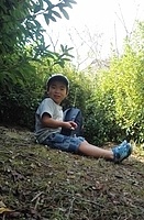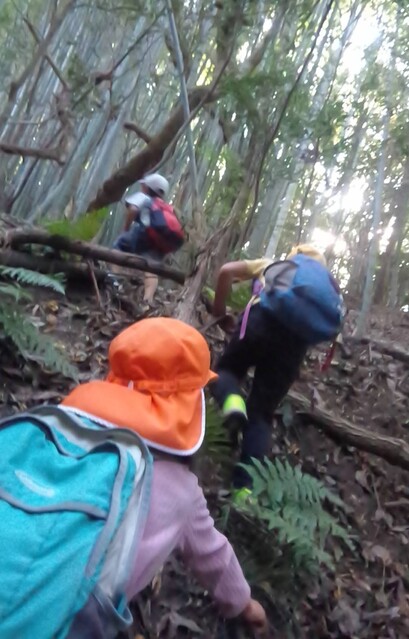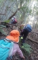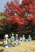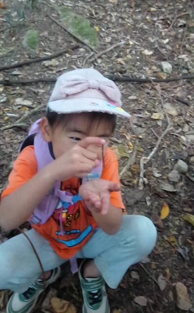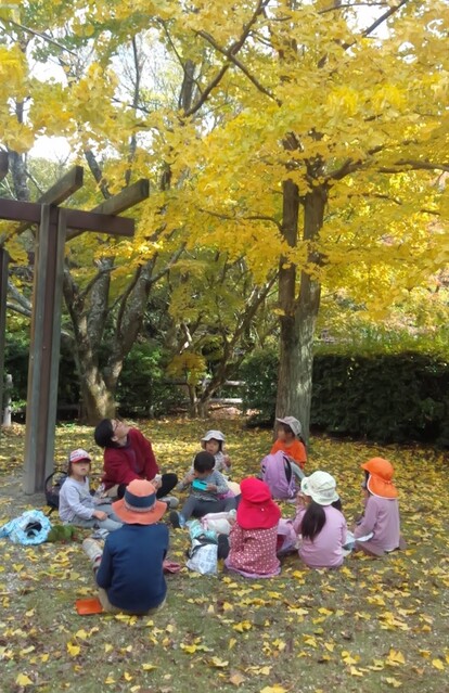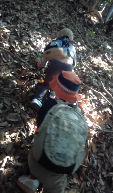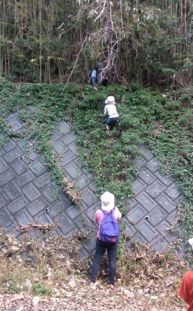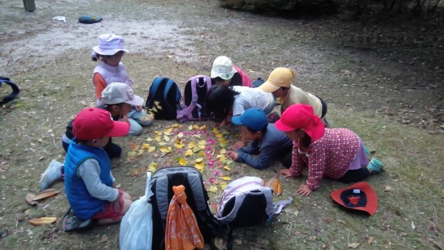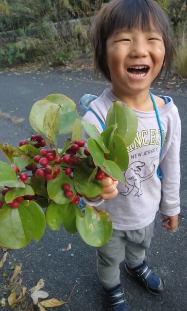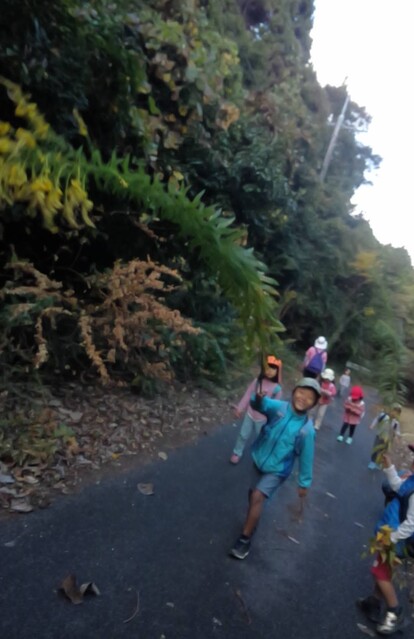 大星山の近くの箕山学習の森まで行くことにした。 赤コースから山に入って、スカイラインに出る。 歩きながら、女の子たちが小さな枝を人差し指にくっつけて「落ちないよ〜」って、やってる。 やってみたら、ほんとに指にくっついたまんま。 手品みたいだね〜。魔法みたいだね〜。おもしろい。 いろんなこと、発見するんだね。 スカイラインに出たら、冬イチゴやむかごを探しながら歩いた。 むかごが、いっぱいだった!! もう、たくさん過ぎて、ちょっと歩いて止まって取って。 を繰り返し進む感じだった。 そして、今のむかごが、とっても美味しい。 いつも、なりだしたらすぐにとって食べてしまうけど、味が濃くなって甘くて、全然味が違う。 よかったね〜。こんなにまだあった(*^^*) 途中のコンクリートの壁。 つるがけっこう強いから登っていける。 でも、めちゃ高い。。。あっきーが行けることを確かめてから、やりたいけいご、ちほ、かほがチャレンジ。 かほが、やりたいといって登っていったのには、びっくりだった。 かほが、すごくいろんなことに興味を持って動いてる。 セイタカアワダチソウがすごく長く伸びている。 それを折って持って歩いてるゆずき、なおと。 これが、高いところにあるむかごを落とすのにめちゃ便利! 叩いて落とす。 落ちたのを拾う。 そのうちにけいご、きよひともセイタカアワダチソウを取ってる。 これを持ちながら歩く。 竜だ!と言って。 うん、しなったりする様が、たしかに竜みたい。 わたしも、竜ごっこに加わった。 男の子たちが、ごっこ遊びに夢中になってるのが面白かったし、楽しかった。 ずっと、楽しく歩いた。 らくは、赤い実のついた葉をたくさん持ってる。 箕山学習の森に着いた。着いたのは、13時近かった。 今日は、遠かった〜。 お昼にしよう。 紅葉してる。赤や黄色きれいな時期で良かったね。 きよひとは、真ん中の茂みの中にひとり。ここで食べたいのだと言って。 好きな場所で。一人だって平気。 食べたあとは、葉っぱを集めたり、並べたり、いぬ、ねこごっこしたり、けいどろしたりしてすごしてた。 by よっこ |
