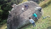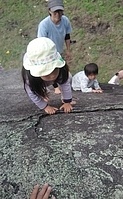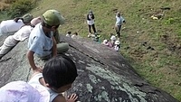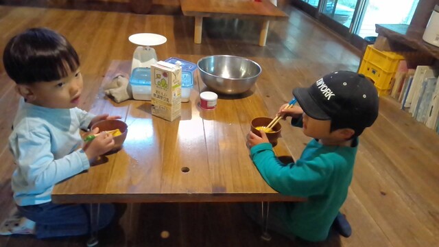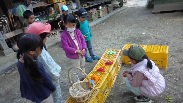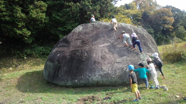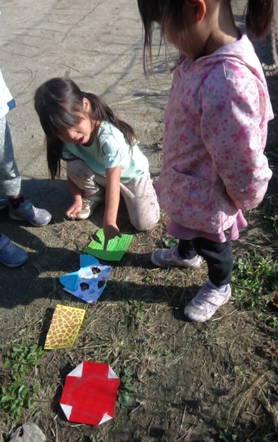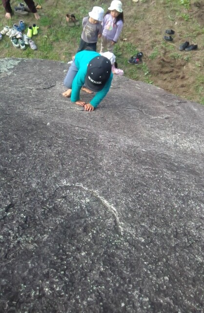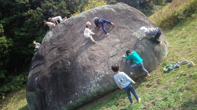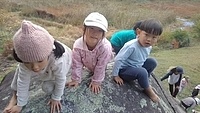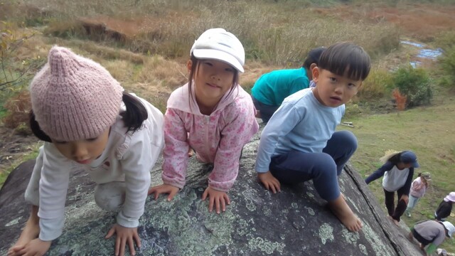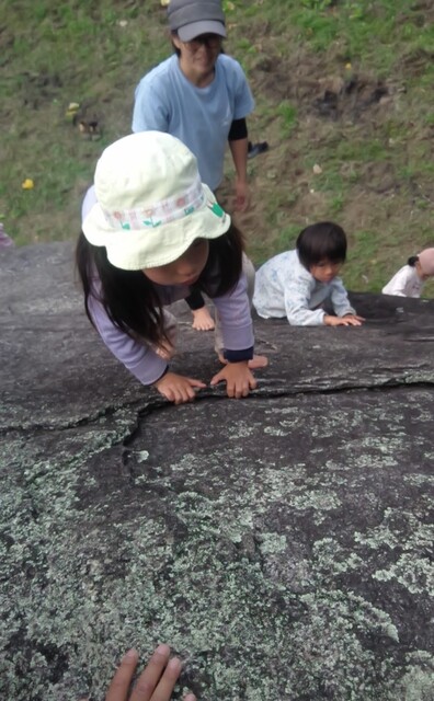 なので、お昼からは、ちほのおみせやさん。楽しみ〜。 今日は、午前中は田布施の大岩へ行くことにした。 最近、なんだか登るのとか好きそうだし、今、ちょうどいい時期かな。 なんでここにこんな大きな岩があるのか。。。。って、ところにある大岩。 この岩が、おうちえんの子たちには、チャレンジするのにもってこいの場所なのだ。 大きな岩に登っていくための最初の手と足をかけるポイントが小さい子たちにとっては、行けそうで行けない。 去年登ってるのは、さゆき、けいご、あみ、の3人。 さて。今日は。。。 いやあ、、びっくり。 けいごを先頭にきょう、ちほ、さゆき、ゆずき、あみ、が、次々に登っていった。 去年は、頑張ったけど、できなかったちほ、ゆずきも、去年は、やらなかったきょうも、すいすい。 やっぱり一年は大きいね。 体が大きくなったのもあるし、体の使い方が上手にもなったんだね。 ゆずきは、おりたりのぼったりを繰り返していた。 みつきは、最初から登ろうとしてた。 いくらみつきがいろんな事できても、さすがにこの岩はまだ無理やろう。。。と、思ったのだけど。。。 え!!登ってきよるやん!!そして、岩のてっぺんまで来た。 びっくり!なんてすごいの!身体能力の高さにふるえるわ。 笑ってた。 すると、かほも登ってきた。 こないだ、コンクリートの高い壁にも登ってたし、やる気! だけど、今日は、怖さが半端なかったようだ。 途中で止まってしまってからは、動けなくなった。 行きたい、でも怖い。 十分だと思う。 ナイスチャレンジ! わたしは、いちかやみおにも声をかけてみた。 やってみる? そしたら、やってみる!だった。 そうなの!!? そして、いちか、みおも登ってきた。 なんと、みなとも。。。 こんなにたくさん登ると思ってなかったわ。 わたしも登るには登るけど、いや、けっこう難しいよ。 けいごは、もっと難しいところから登ってみたりしてた。 いちか、みお、ゆずきの3人が上でゆっくりしてた頃、下では、かくれんぼが始まった。 うまいこと隠れてる子もいた。 結構、盛り上がってたね。 そろそろ帰ろうね。 そして、おりるほうがドキドキで、いちか、みおが、なんとか踏ん張ってる姿がいじらしくもあった。 ごはんのあと、ちほのお店屋さんへ。 並べられたおにんぎょう。 わたしは、おとなげなく並んで、欲しかったお人形をゲットしたのだったm(_ _;)m みんな、気に入ったお人形を持って、動かしながら会話したりした。 ちほは、やりきった感じで、満足そうだった。 みおが、「みおもお店屋さんやりたい!」と言って、折り紙で商品を作り出した。 なんか、いいよな〜(*^^*) お部屋では、みなと、みつきが、パンケーキの準備をしてた。 みなとが割った卵が、テーブルの上に^^;あるあるだわね。 ドンマイ! パンケーキ作りは、みつき、みなと、さゆき、きょう、みなぎでやっていた。 ふゆいちごジャムは、みなぎが、りっか、みなとと少し前に作ってた。 それをパンケーキにのっけてた。 お店屋さんが終わったあと、わたしたち(ちほ、かほ、いちか、あみ)は、大繩をしに行った。 大縄をとんでたら、みおが、はしっておりてきた。 そして、「お店屋さんしまーす。」と言って、地面に品を並べた。 顔の目の部分が穴開いてるお面みたいなのとか、かがみとか、リボンとか、鬼のパンツとか、わにとかオリジナリティにあふれてる。 みおの発想は面白い。 売れ売れ。足りなかった。 それで、もっと作ってもらうことできますか?って聞いたら、「いいですよ〜」と、また、走ってお部屋に帰っていった。 そして、しばらくしたら、また、「はい、どうぞ〜」とお届けに来た。 おわるとみおも大縄に混じった。 みおの大縄をとぶ姿、あんまり見たことなかったな。 かわいい!!どしんどしんしながら、笑ってとんでる。 by よっこ |