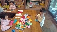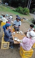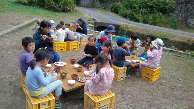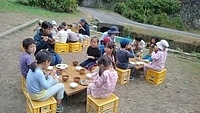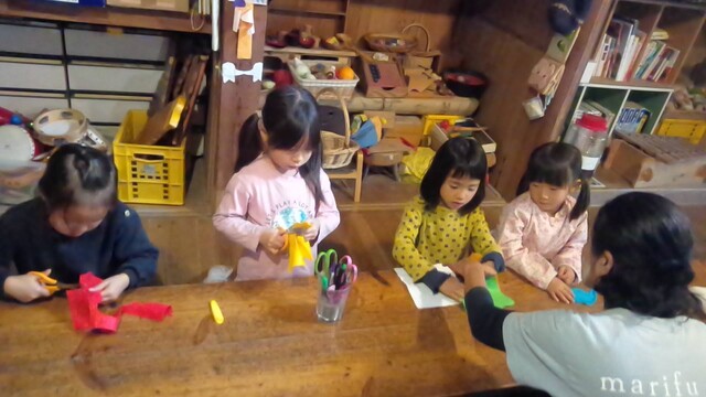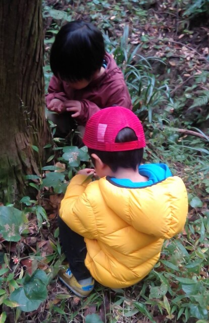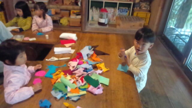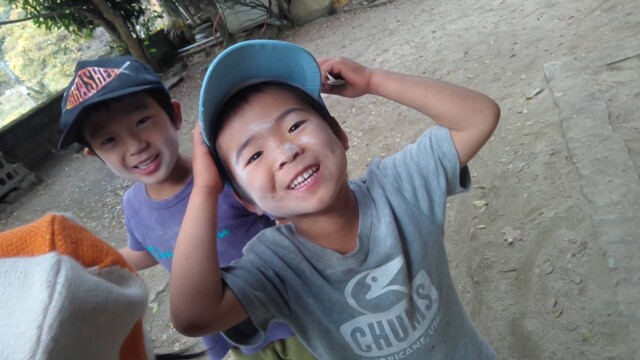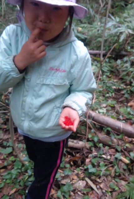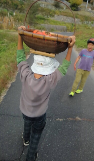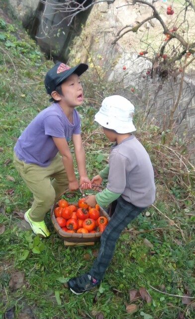 この場所は、いつも冬いちごがなるのが遅いから、もしかしたら、まだ行くのは早いかも。 でも、様子を見に行きたい。 一緒に行くといったのが、いちか、さゆき、みつき、りっか、みなと。 行く途中に卵の殻が落ちていて、これってなんの卵だろう?と触ってみたりした。 みつきは、顔くらい大きな葉っぱを見つけて持って歩いてた。 冬いちごポイントについた。 う〜ん、まだ、少ないかな。。。それでも、みんな、じっくり葉っぱの下を見ながら、見つけては、取って食べてた。 もう少し経ったら、もっとなってるかもね! さて、お昼が近い。 そろそろ帰ろう。 今日は、のびのびになってる「おそとでごはん」を。 おそとは、日がさせばあったかさをたっぷり感じることができる。 だけど、この時期、お部屋の中は、寒い。 なかでも、キッチンが冷え冷えなのだ。 そんな中で、いつもご飯を作ってくれてるキッチンスタッフ。 今日は、ななちゃん。 ねぎらいの気持ちも込めて。そして、お外ごはんは、気持ちいいしね。 冬いちごチームは、おひるごはんのセッティングも担当。 いちかが、「お庭よりも下がいい。」って言って、運ぶのも張り切ってお手伝いしてくれた。 みんなで、行ったり来たりして、準備バッチリ(^^) ももちゃん、きよひと、なおと、きょう、けいご、ちほ、あみは、忍者修行をしに山に入っていた。 きょうが、竹の白い粉を顔に塗り始めた。 「これ塗ったら、透明になれる。」 きょう、なおと、ちほ、ももちゃんが、塗る。 きよひとは、みんなの様子を見ていた。 きょうは、「ここも。」「ここも。」って、顔だけじゃなく白い粉を塗ってたらしい。 竹に抱きついたりして。 いい調子〜♪ 帰ってきた。 きよひと、めっちゃ塗ってるやん! (このあと、しばらく、山に入ると顔を白く塗るきよひとだった。一番ハマってた。) そして、そのまんま、ご飯食べていた。 みなぎ、ゆずき、みお、かほ、まひろは、別の山に入って探検してきた。 つるを見つけてぶら下がって遊んだり、電車ごっこしたりした様子。 みなぎが、葉っぱで仮面を作ってつけて帰ってきた。 みなぎも、仮面をつけて食卓に。。。 白い顔や仮面の顔。。。シュール おそとごはん。 ななちゃんが、喜んでくれた。 また、やろう。 お昼から、ぬいぬいのメンバーが、みお、あみ、さゆき、かほ、みなと、いちか。 今日も、可愛い作品ができた様子。 他のメンバーは、けいどろ、かくれんぼ。 わたしは、ゆずき、きょうと柿もぎに行った。 取ってもいいよと言ってもらっていて、散歩中にかじったりとか、おやつの分を大量に頂いたり、干してみたりしてた。 今年は、まだ、取り切れないくらいなってる。 それで、また、みんなで食べる分を取りに来た。 わたしが、高枝切鋏で取ったのをゆずき、きょうが枝を取って、かごに入れてくれた。 半分は、リュックに入れて、半分は、かごに入れて持って帰った。 (次の日からしばらく食後のデザートに食べていた。) 今年は、たくさん柿を味わった。感謝。 by よっこ |