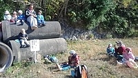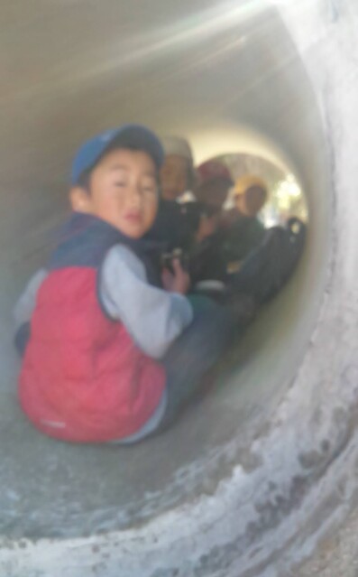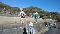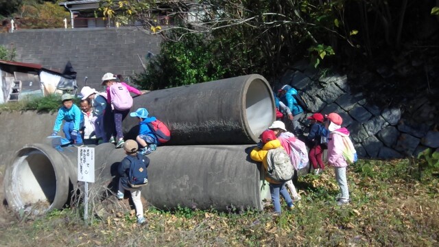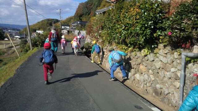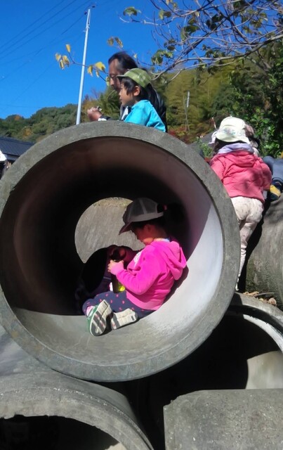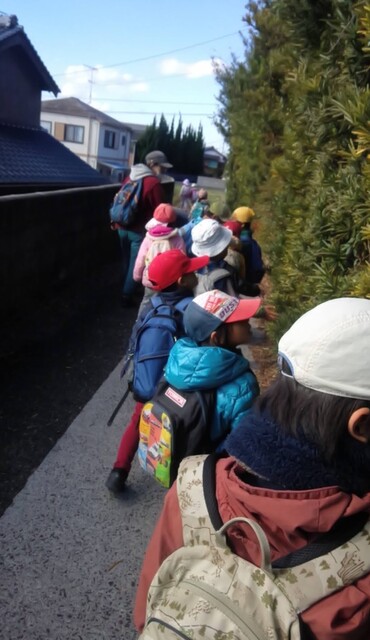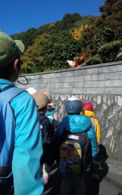 以前、赤子山に行ったときに柳井の町におりていったことがあった。 その時にきよひとが、ここからオレの家に行けると思う。行ってみたい。と、あっきーに言った。 さすがにスタート地点やルートは、考える必要がある。 けど、なんとか叶えたいなと思ってた。 それで、あつおさんが下見してなるべく車が通らない道。町ばかりじゃなくて、山の中も通るような道。を見つけてきてくれた。 わたしも、どこ通るのかわからないし、きよひとのおうちをさがすのも楽しみ〜(^^) 出発地点は、柳井の金剛寺。 着いて歩き出すとなかなか素敵な小道に入った。 そして、塀の上になんと!鶏がいる!! しばらくそれを見ていたら、お家の人が出てきてくれていろいろお話してくれた。 お庭で放し飼い。6羽くらいいたかな。 とってもきれいな鶏だった。 そして、塀を越えては行かないんだって!びっくり。 おうちえんの鶏は、塀の上から私の畑まで飛んだりしてた^^; また、帰りにも会えるかな。 さあ、行きましょう! 静かな住宅街を進んだ。 細い路地もあった。みんなが知ってる大通りも歩いた。 アデリーホシパークくらいでおひるごはんと考えていたけど、歩いているうちに小高い場所に広場があって、大きな土管があった。 そこがあたたかくて気持ち良い場所だったからおひるごはんはここにしようってことになった。 早めのお昼ごはん。 好きな場所を選んでおむすびを食べた。 食べたら、しばらくは、土管にのぼったり、くぐったりして遊んだ。 また進もう。 フラワーパークの横を通って、大きな道の歩道を歩く。 そうしてたら、どんぐり拾いとか、(えんにおみやげ)むかごひろいとか、(めちゃ歩道に落ちてた!)冬イチゴも見つけて食べた。 きよひとのお家の近くになってきたみたい。 ヒントは、緑の屋根。 知ってる子は、言わないように。 で、探して歩いた。 あみが、「あれ、みどりのやね?」と気づいた。 正解だった。 ここがきよひとのおうちなんだね〜。 おうちの下の坂道から見た。 向かいの道にきよひとのおばあちゃんが待っていてくれた! そして、柿の木になってた柿をみんなに一個づつくださった。 犬のまるちゃんにも会えた。 まるちゃんが私の柿を食べた。。。(^_^;) そして、きよひとのお父さんのHさんの畑に寄って、また、別の住宅街を進んだ。 そこから、すこし山の道に。 ああ、気持ちいい道だな。 山の道をおりたら、最初に通った道に出てきた。 帰りにまた鶏に会って寄り道、ゴール。 柳井の町探検、おもしろかった! きよひとの願いも叶ってよかったね。 by よっこ |