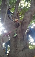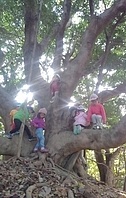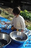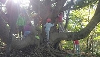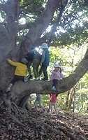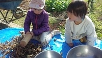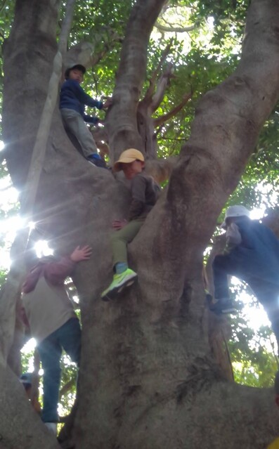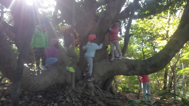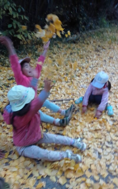 みおが、掃き掃除するのを手伝ってくれた。上手に箒を使う。 今日は、午前中は、森の中で過ごそう。 コースは、ガリヨシの横から入って、鉄塔のある山に行って、その近くの大きな木で遊び、亀の池に出る道。 森の中に入ると、自然に実によく遊ぶ子どもたち。 楽しいことを見つけることも、遊びを思いつくこともとっても大事な体験だ。 倒木の一本橋渡り。木をなにかに見立てて乗っかる。気に入った棒を見つけては、持つから、手が一杯で持って歩くの大変そうな子。木に登る。斜面を滑る。棒を両手に持って、スキーと言って落ち葉の上を進む子。つるのブランコ。 寄り道をたくさんしながら、遊ぶ。 鉄塔に登る道は、本来、中電の人が通っていけるように階段になってた。 だけど、今日、久しぶりに通ったら、イノシシに荒らされてて、階段は、崩れてる。 子どもたちは、上手に歩いてて、特に問題なく登っていってた。 途中からは、山の斜面を登ったほうが近道だ!と言って、そっちに進んでた。 てっぺんに大きな木がある。久しぶりだね〜。 その大きな木に子どもたちが次々に登る。 周りにある木にも挑戦してる子もいる。 存分に楽しんでる。 おりようか。 ここから、どこに出るでしょう? 前にも来たことあるメンバーも、う〜ん、どこだっけ。 降りる道は、きょうが先頭になってこっちだと思う。と、進んだ。 うん、いいよ!いってみよう。 迷いなく進んでいる感じが、素敵。 まだ、みんなは、わかってなかったけど、そのうち、ここ、亀の池のところじゃない?って、気づいた。 降りたところに冬イチゴがたくさんあって取って食べるのに夢中。 さて、前は、田んぼで、すぐに出られたのに、ずいぶん草が茂っていて道が見えない。 自分より背の高い草をかき分けて道路に出た。 帰り道。 けいごが、ぴよぴよごっこを始めて、みんなが、「ぴよぴよ」 ぴよぴよ語で会話しながら遊んでた。 イチョウが道に降り積もってた。 なおとが、いち早くそこに寝転がった。気持ちよさそう。 ずっと、寝転がりながらそこにいた。 そのなおとの動きが考えるより先にもう体が動いちゃった感じが見ていて清々しかった。 たくさん、イチョウの葉を集めて、かほが、かけに来た。 みお、いちか、ちほは、座り込んでイチョウの葉を振り撒いてる。 たくさんの子が、イチョウの葉をふらせてた。 お昼からは、わたしは、黒豆の選別をした。 おうちえんの子が撒いた黒豆だ。 「何してるの?」 「豆パンパンしてるよ。」 みなと、らく、まひろ、ちほが、お手伝い。 木槌で叩いて鞘から豆が飛び出す。 それが面白くて笑いながらやってる。 豆を集めていいのと食べられないのを分けてくれる。 助かる〜。 そして、一緒にできるのが嬉しいよ。 by よっこ |