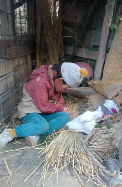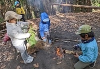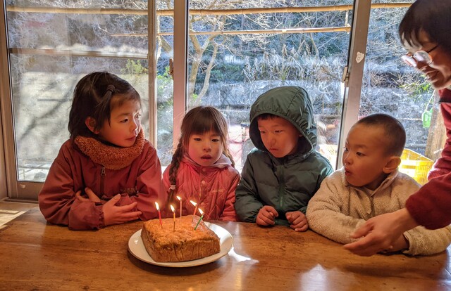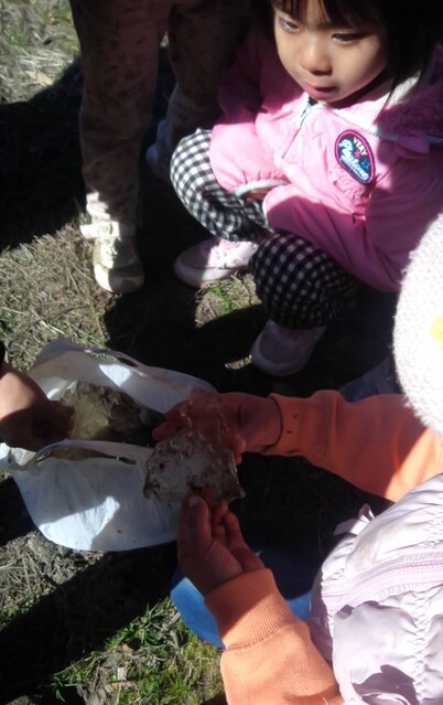 今朝は、とっても冷えた。 今朝も、エンのところに行った。 まだまだ、さみしくてたまらない。 安らかな顔をしていて、ホッとする。 周りには山茶花の花が飾ってあって、鶏がやってきて、エンの背中に乗っている。 なんとも言えないやさしい景色だと感じた。 エンのことが大好きで毎日毎日誰よりもエンと過ごしていたのは、りっかだ。 昨日もおうちえんが終わって夕方までエンとの時間を過ごしていたそうだ。 たくさん触って、一緒に寝て。 今日も、登園してすぐにやってきた。 エンのそばに座って、触って、「エン、起きて。」と言った。 そうして、しばらく触ってから、ふと、何も言わないで、うつむいたままになった。 結構長い静かな時間が流れていた。 その間、周りには、エンとのお別れをしに来たお母さんたちが何名かいたのだけど、誰ひとりしゃべらなかった。 そのことが、とてもありがたかった。 りっかは、エンの死を受け入れたのかな。と、思った。 そうして、りっかに「また、後で来れるから、ミーティング行こうか。」と声をかけた。 りっかは、もう、そのあとエンのところには行かなかった。 わたしも。 今日、氷探しの散歩にちほ、みお、まひろ、みなぎが出かけた。 寒い中、みんな、元気に歩いた。 霜柱も見つけたらしい。 トンボの池でみおが、氷を踏んで、ズボッとハマったらしい。 冷たくて耐えられないだろうから引き返そう。と、みなぎが提案したみたいだけど、みおは、大丈夫!と言って、散歩を続行したらしい。 ちほは、袋に氷を入れて帰ってきた。 残ったメンバーは、けいどろ、おおなわ。 だるまさんがころんだ。も、盛り上がってた。 お昼ごろ、てらこや、おうちえんの全員でエンを見送った。 りっかと一緒にいた私。 りっかが、「エンちゃん、バイバイ。」と言った。 午後、わたしは、山の広場に行った。 きよひと、けいご、みなと、ゆずき、いちかと。 そりすべりしたり、焚き火して過ごした。 ちほは、午前中に取ってきた氷で遊ぶ。 みお、まひろ、あみと。 川に氷を流したりしてた様子。 by よっこ |