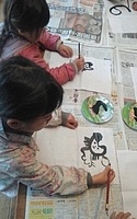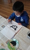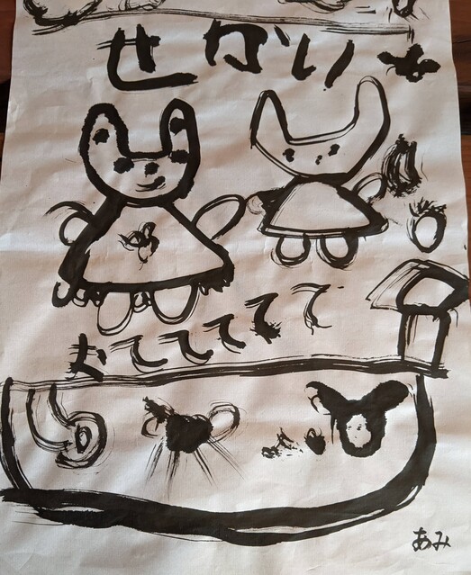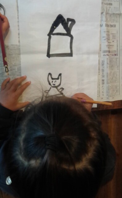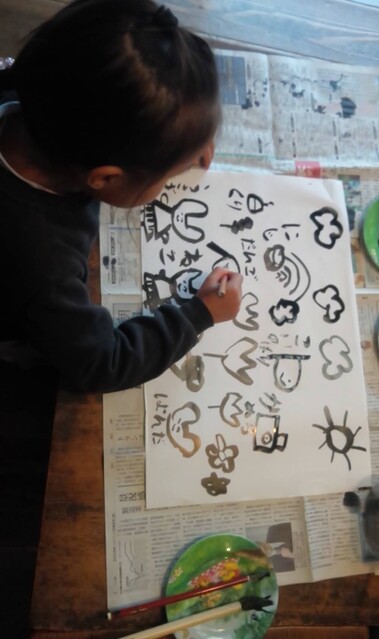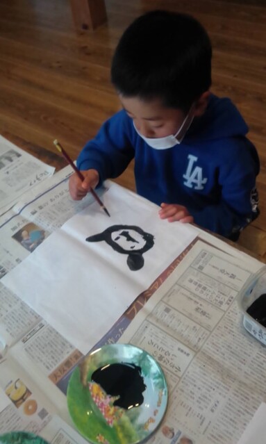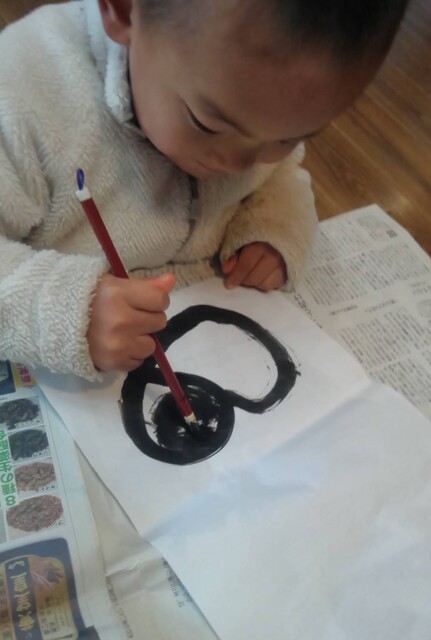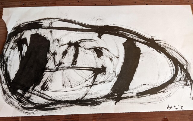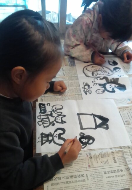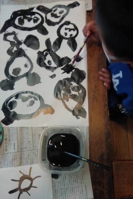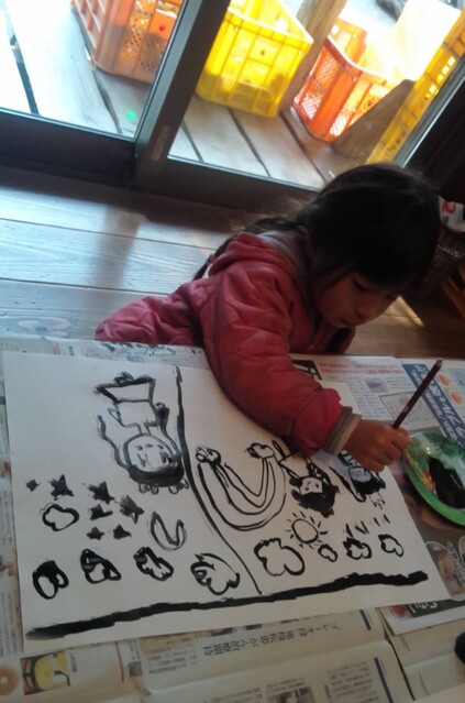 昨日、がりよしの石の近くから少し山を入っていったところにおうちをつくりはじめた子どもたち。 今日も、続きがしたいきよひと、いちか、あみ、新たに作りたいけいごが、あっきーといっしょに行ってた。 昨日、きよひとのひとりで作り込んだ家(りっぱでびっくりした!)や、いちか、あみ、さゆきが作りかけてる家(立体的になってきた!)を山探検の帰りにわたしも見てた。 まだまだ作りたい気持ちがいっぱいの3人に、昨日は、探検組だったけいごも触発されてたんじゃないかな。 以前は、きよひとは、だれかのおてつだいしかしてなかったし、女の子たちは、木で囲いをするくらいだった。 それが、ちょっと、気持ちもやり方も進化してる。 どうしようかな。。と考えながら、きよひと、けいごが黙々と集中してたそう。 いちか、あみは、昨日のところはやめて、新たに作り出した。 登って遊んでた大きなつるを家の中に組み込んでる(^^) 2人で長い木を運んでたそう。 「このいえ、もちつきできるんだよ。」って言って、おもちつきもしてたみたい。 何度も何度も通いながら家作りやごっこ遊びを楽しめたらいいね。 それができる環境だし、いい季節だし。味わいたいね。 みなぎ、ちほ、ゆずきは、こちらも昨日の探検の続き!!と言って、昨日は行かなかった側の尾根を通って知らない道を歩いてきていた。 わたしは、けいどろ。 なおと、りっか、みなと、かほ、まひろ、さゆき、らくと。 てらこやのこもまじってた。わたしは、ろくだいとけいどろがやれたのがうれしかった。 午後は、書き初め。 書き初めと言っても、墨汁で絵を描く感じ。 筆は、習字用の。 さゆき、いちか、なおと、みなと、あみ、りっかが書いた。 みんなが躊躇なく筆を動かしていて、熱中していて、静かで、一枚を書き込んでて、まだ書きたいと何枚も書いているのが印象的だった。 特にさゆきやいちかは、お絵描きするときに、誰かが描いたのを真似して描くことが多かった。のだけど、そういうのがなくて、ただ、目の前の紙に書きたいものやことばをさらさらと書き進めてた。 あみは、もともと自由な感じ。で、今日も、あみにしか思いつかない作品になってたな。 さゆき、あみ、いちかは、字を書くのも楽しんでた。 なおとが、ここで絵を描くこともほぼなかったから、最近こんな絵なんだ!しかも、かわいい〜し、のびのびしてるな〜と新鮮だった。 みなと、りっかも、迷いのない素敵な線だ。芸術。 みんなが描いてる間、見てても楽しかったし、わたしも字を書くのを楽しんでた。 墨で字を書くのは、好きだ。 とても気持ちがいい。 by よっこ |