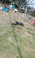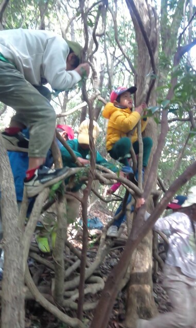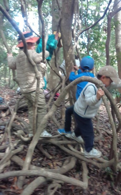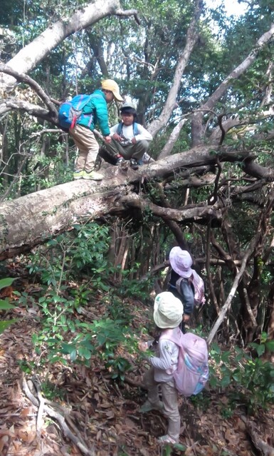 下見を2週間前になおと、きょう、ゆずきとやってるから準備は万端(^^) 赤コースから上がっていく。 スカイラインに出る手前の道を小さい人も難なく行けるようになったなあ。と、一年前の頃を思う。 歩きながら、「雪のお母さん」と呼んでる綿毛の入った実を取って、綿毛を飛ばして遊びながら行く。 きくらげのなってる木を見つけて取ってる子もいる。 春の日差しが心地良い。 ナビばっちりで、歩き進む。 鉄塔に出たら、転がって遊ぶ。 しばし繰り返し楽しむ。 さあ、ここからまた森の中へ。 伸びた草をかき分けて、トゲトゲのタラの木を触らないように気をつけて。 少し入ったら、木に登ったり、ジャングルジムで遊んだりできる。 ジャングルジムはつるで出来てるから乗ったら、ビヨンビヨンなる。 細い木にあみ、みお、いちか、ちほ、けいごが、登り棒のように登っていく。 さあ、行こうか。 今度は、尾根を降りていく急斜面。降り積もった落ち葉の上を滑り降りていく。 今日一番の難所に来たぞ。 下見の時、わたしが心折れそうになった笹竹がみっちり生えてて道がなくなってしまってるところ。 一応、このあいだ、ヒーヒー言いながら、なおとたちに励まされながら道を作った。 大丈夫かな、、、行こう。 下見した3人が、前を進んでる(^o^)頼もしい。 狭い道を一列になって少しづつ進む。 茨があれば、声をかけてみんなが危なくないように心配りしながら歩いてる。 この前は、何分もかかったこの箇所を今日は、スムーズに進めた。 そして、山越えてきて、いつもの場所でおむすびを食べた。 デザートは、奄美のたんかん。美味しいね〜。 食べたら、ごろんごろん草の上でくつろいでた。 また、進むよ。 少し行くともう海が見えた。 牛さんに会いにいく。 かわいい子牛もいる。 興奮して気が立ってる牛さんもいる。 暴れてたからちょっと怖い子もいたね。 牛さんもびっくりしてたかもね。 牛さん、ありがとね〜。 そして、お次は、ポニーちゃん。 元気?今日も、いっぱい草の実が体のあちこちに付いてるね。 バイバイ。 では、最後の川沿いの道。 かわをながめたりしながら、進む。 歩きながら、つくし取りに夢中なのは、ゆずき。 もっと、取りたいって言ったから、ゆずき、みなとは、つくし取りをゆっくりする。 たくさん生えてるから、取るのが楽しい! そして、海に着いた。 先に行ったメンバーが遠くに見える。 今日は、大潮だったからめちゃ潮が引いている。 カニ取り、亀の手取り、うなぎみたいな魚取り(あっきーがあとから調べたらミミズハゼっていう名前の生き物だった)をしたり、裸足で歩いたりして気持ちよく過ごした。 ここでお迎え。 みんな、よく歩きました! by よっこ |